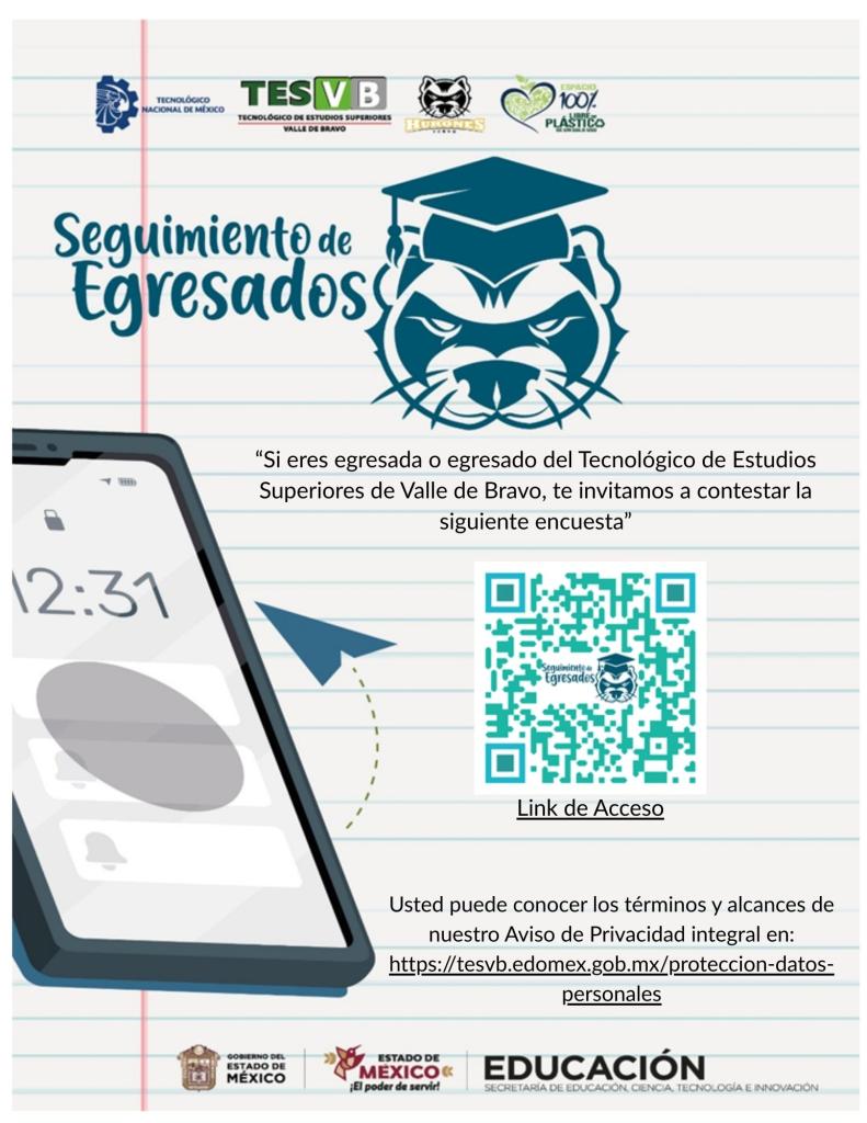 El objetivo de Seguimiento a Egresadas y Egresados del Tecnológico de Estudios Superiores de Valle de Bravo, es evaluar la pertinencia y la calidad de los planes y programas educativos, nivel de satisfacción de egresadas y egresados con su formación, su inserción en el mercado laboral y la satisfacción de las necesidades de los sectores empleadoras y empleadores por medio de encuesta, por lo que las y los egresados deberán requisitar las encuestas correspondientes al programa educativo del cual egresó.